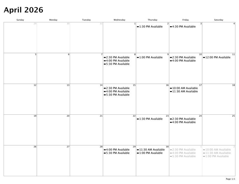 Calendar of Availability for March & April