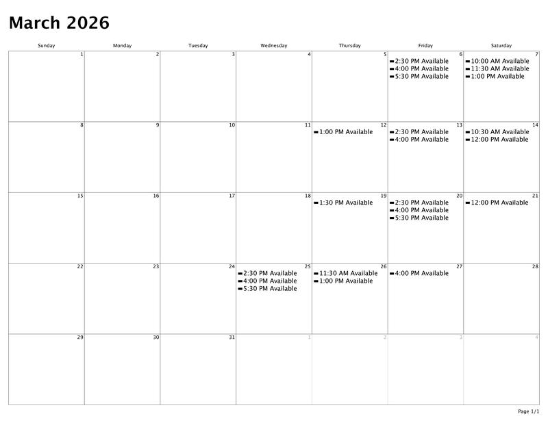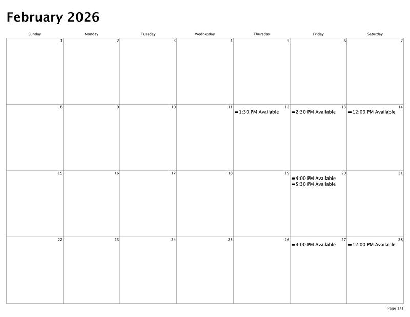 Calendar of Availability for Feb 2026