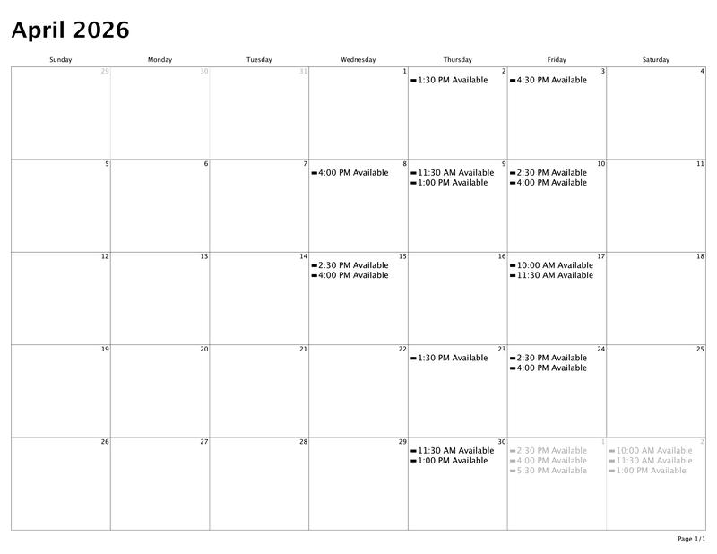 Calendar of Availability for March & April