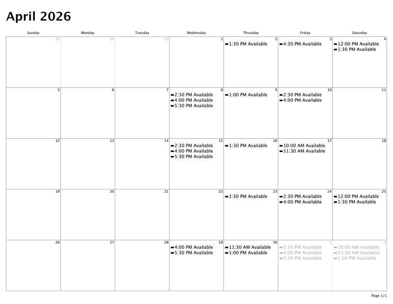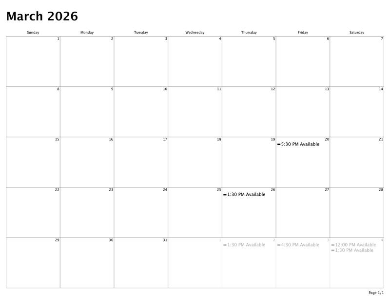 Calendar of Availability for March & April